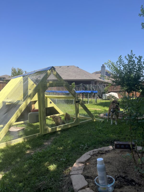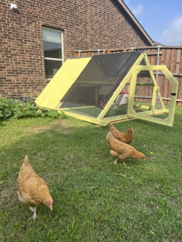 I built the chicken tractor (yes I did!) with wheels on the back so I can roll it around the yard and put them on fresh grass every few days.