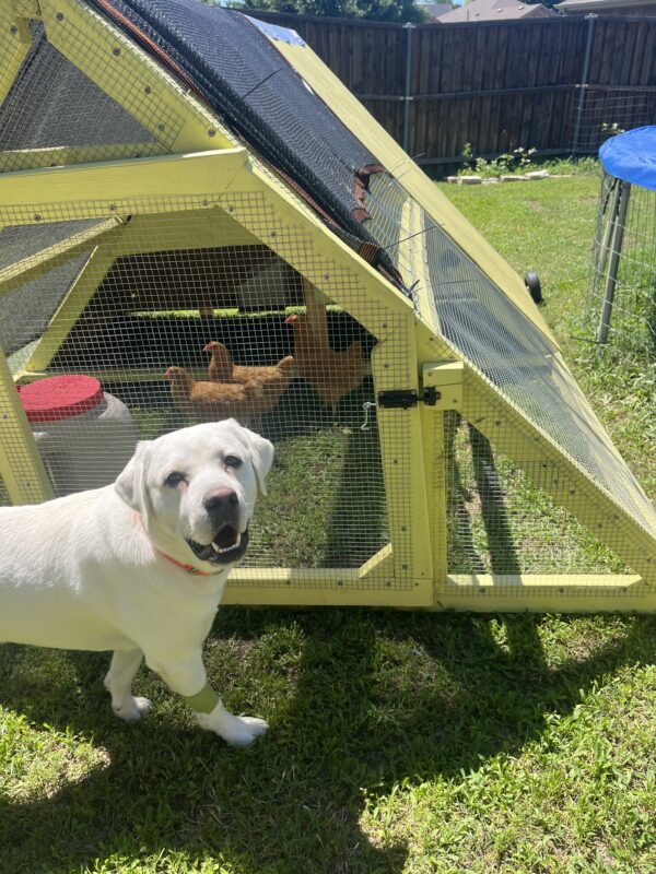 The dogs are regularly frustrated that they can’t get at the chickens, but they have mostly calmed down and approach them with interest, not as prey.