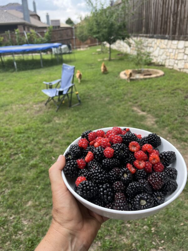 My garden is in the middle of spring harvest and my food growing dreams are coming true. I’ve always wanted to have berry bushes and fruit trees — the trees make take a few more years to bear fruit, but the berries are booming. And I finally have raspberries! They are not usually successful in Texas because of the heat, but I planted a variety that *might* make it here and this year it has finally taken off.