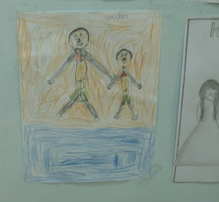 Carter was so excited about his drawing class because his teacher taught them techniques for drawing people all week: faces, arms and hands, bodies, etc. When I arrived he came running up to point out that one of his drawings was on display. He clearly gets his artistic talent from me.