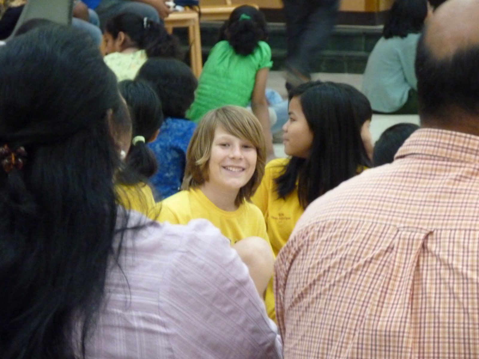 The 170 kids have been divided into color (red, yellow, blue, green) and age groups: Josh was the leader of the Red Omegas (kids age 9-14) and the boys were in the Yellow Alphas (Caleb) and the Yellow Omegas. That’s why they were wearing matching yellow Muscat t-shirts in our moving pictures. We had to run out and get yellow shirts the first night of camp so they could dress in their team colors. Speaking of colors, it’s pretty easy to spot the two kids in the above picture who are related to me — just look for the hair and skin that is lighter than everyone else’s.