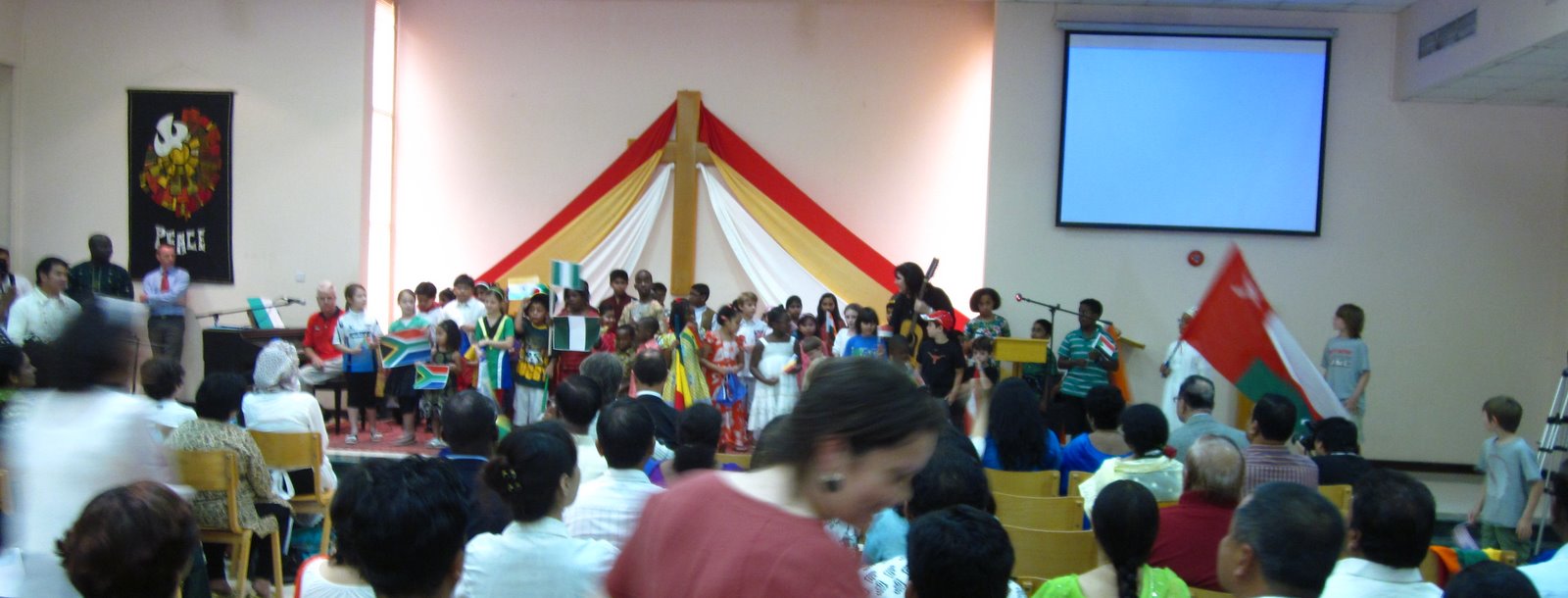 Since they have about 30 minutes to kill, the boys go wander around outside for a while, Josh plays a game on his touch, and I calculate that about the time the service starts is going to be the time that Camille gets restless and wants to go walk around. Yipee for me. Meanwhile the church is filling up with people who look extra dressed up. Lots of tribal clothes and headpieces, extra sparkly saris, there’s even a girl wearing a cute skirt and bonnet who looks like she stepped right out of a “Welcome to Holland” postcard. I look at the program and see that it’s Pentecost so I figure that people must be dressed up to celebrate the holiday they way they did for Easter.