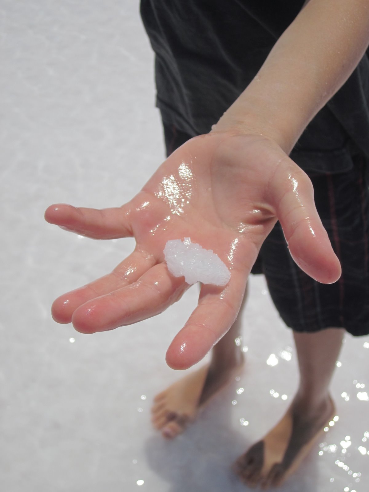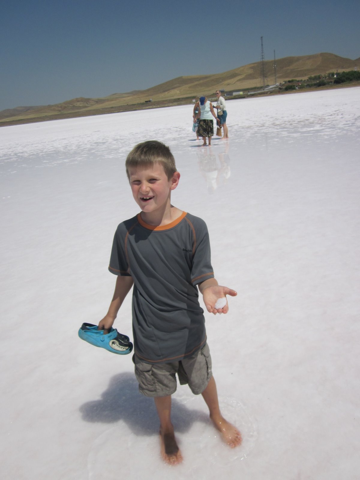 As we walked toward the water, the salt crunched under our bare feet and Calvin pointed out that if you shuffled along you could give yourself a salt scrub. He didn’t heed the lesson of the yellow snow as he commented, “ooh, it’s salty” while we were still walking over the stuff that had turned brown from contact with many, many feet. I explained that he was welcome to taste it, but should probably go for the white stuff instead. Thankfully the salt would have killed any nastiness it came in contact with. (right? right?)