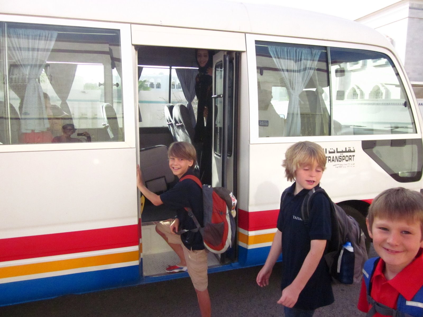 The bus attendant is the woman behind Caleb in the abaya. She makes sure the kids are behaving themselves while the driver concentrates on driving. Josh had to remind Caleb this morning that the person driving the bus was not called the bus boy.