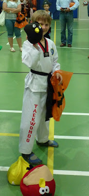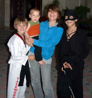 Here we have our Dread Pirate Roberts (with his awesome sword — silver yarn crocheted over a coat hanger. Josh bent the handle into the correct shape and I wrapped it with black fabric to give it the right grip) and our Tae Kwon Do black belt. In the background is our little pumpkin. She is twice as big as last year so the pumpkin “dress” has become a “shirt.”