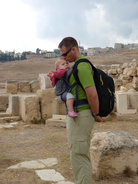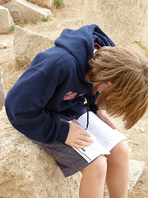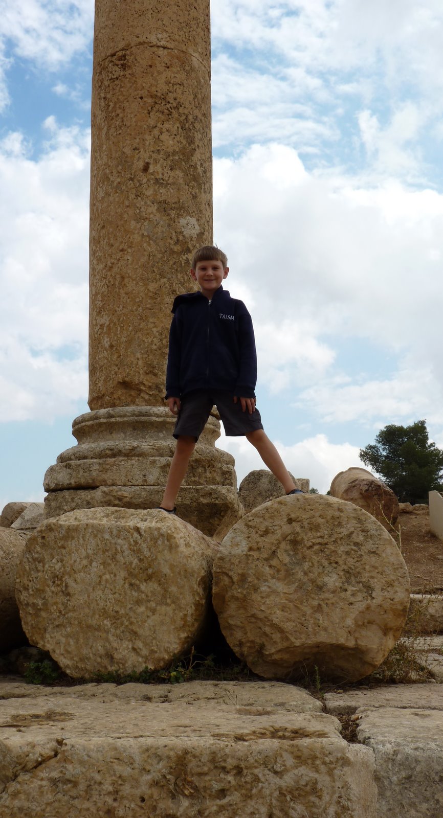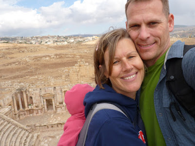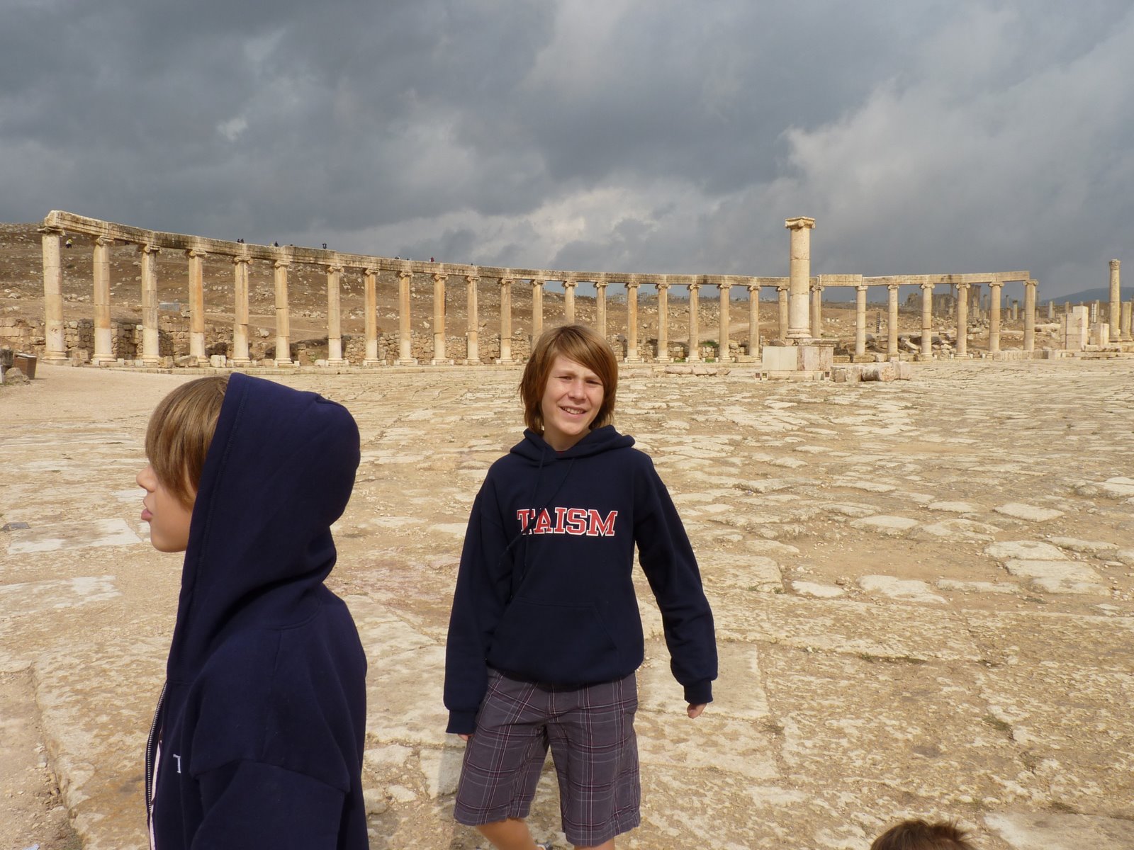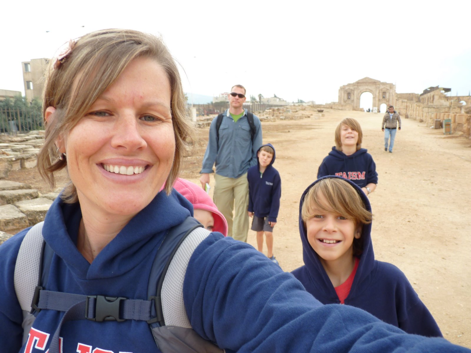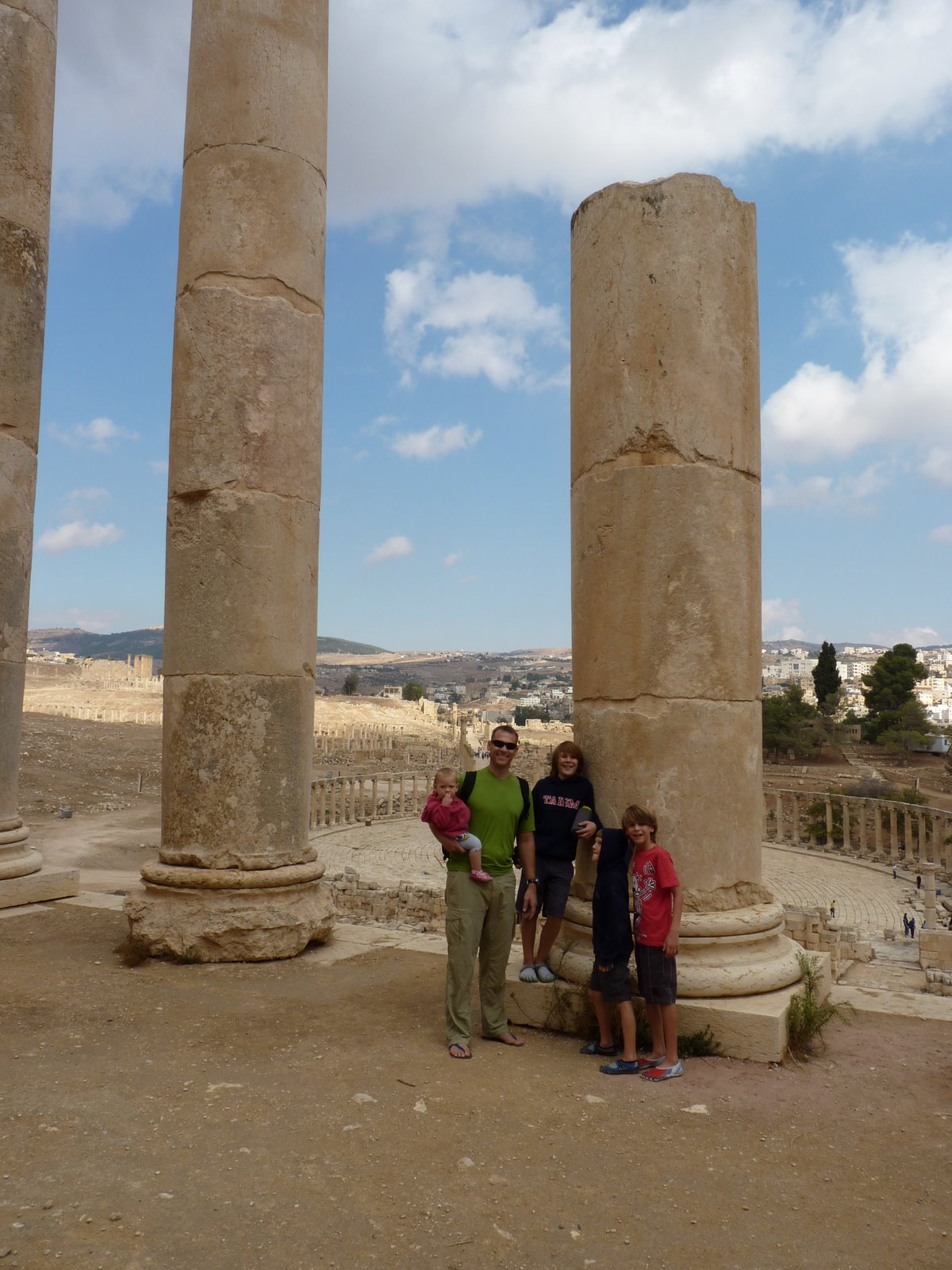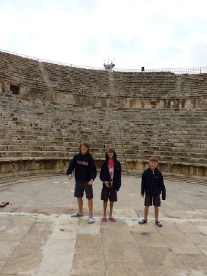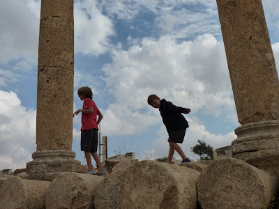 Coming up on Jerash. I included this picture because of the air freshener hanging from the rear view mirror. Later in the week Caleb and Carter had such foot funk from wearing their barefoot shoes nonstop that I took the air freshener down and made them rub it all over their feet on the way to Petra. It helped a little bit.