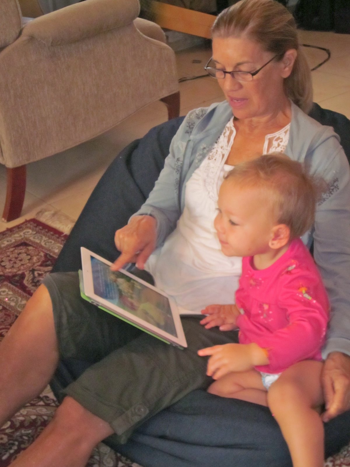 Camille LOVES my mom’s iPad. My mom goes through all the photos and videos with her (Camille does the swiping) and points out the different people and says things like “do you remember when we were pouring water in the back yard? Let’s watch this video of you playing with your tea set.” And then they ooh and ahh over it together. She also has these interactive books (I don’t know if they’re nursery rhymes or fairy tales or what) where my mom can read the text while Camille touches the “page” and makes the cat move or the duck splash and I’m not sure what else, because I haven’t really been paying attention.