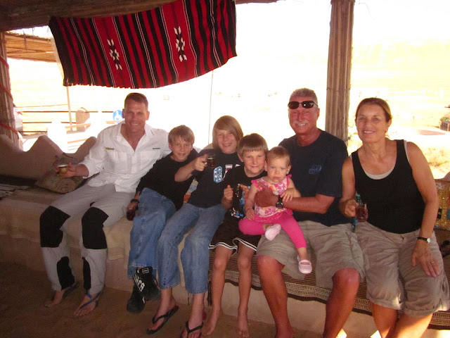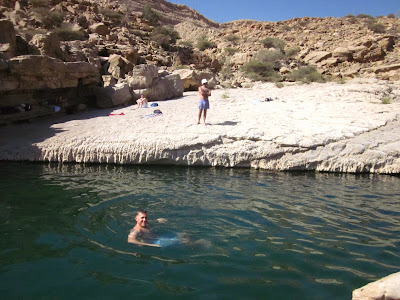 When we left off, happy family was in the desert on their way to Wadi Bani Khalid. After a 40 minute drive back across the sand dunes we stopped to reinflate our tires (you have to let about 1/2 of the air out prior to driving on the dunes or your car will sink and get stuck in the soft sand). While they were putting air back in the tires I saw this sign across the street: