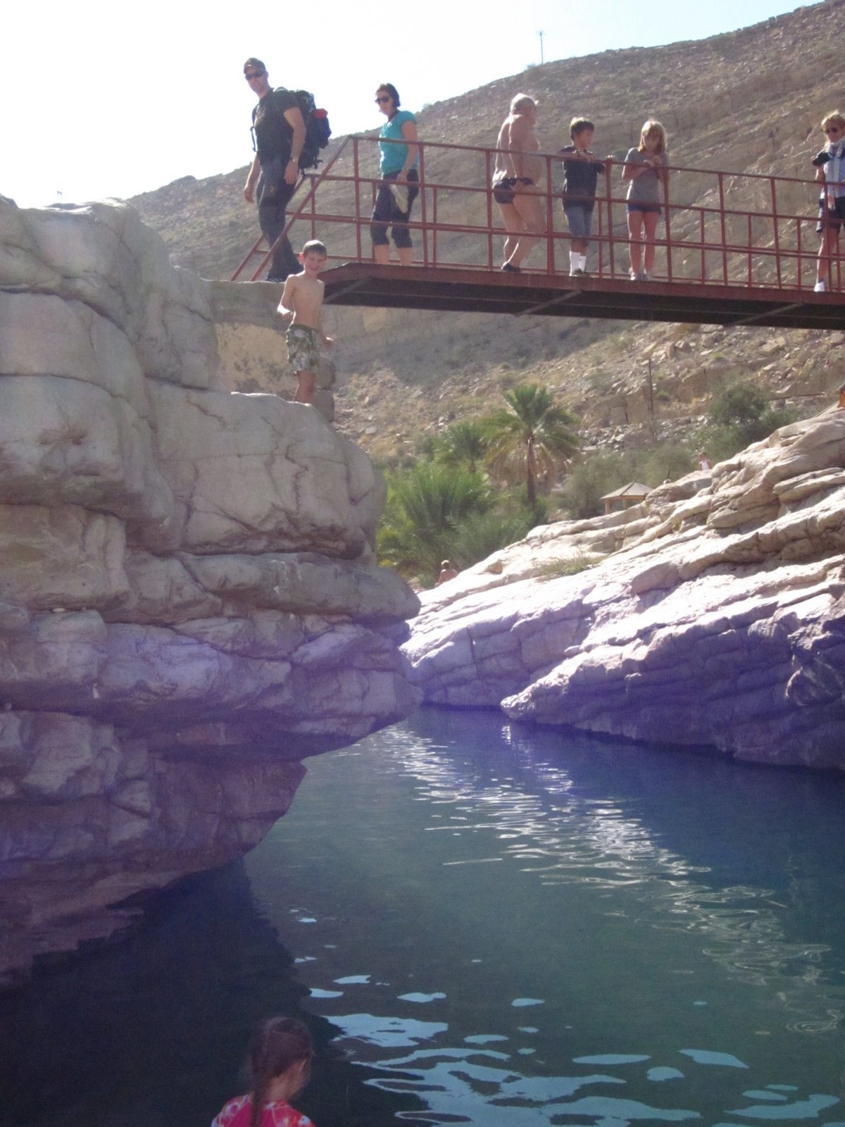 Caleb working up his nerve to jump off the rocks. Eventually he jumped from the bridge, but he wanted to “test the water” first.