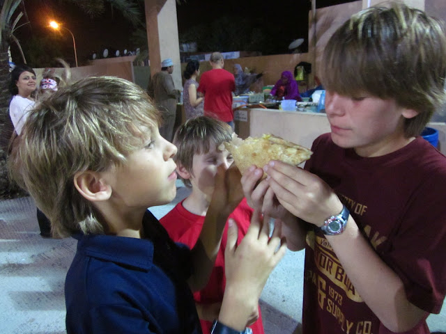 I have a general rule of not eating street vendor food. I also don’t eat samples from Costco or any other food freebies except for the ones from “my” Trader Joe’s where I know all the people working in the sample kitchen. I know my heebie jeebies are irrational/unreasonable so I let the kids eat to their hearts’ content and they never get sick. So I wasn’t going to try this weird bread/egg/honey concoction, but as Josh was offering me a bite I saw an Omani man eyeing me and I didn’t want to look like I was rejecting his food so I took a bite — and it was really good. So good that I had a few more bites even after he wasn’t watching me any longer.