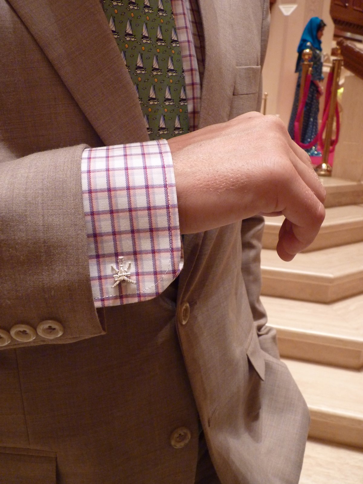 Josh got new cufflinks — the Omani crest. He’s also wearing the suit and shirt he had custom made here. He picked out the fabrics, the tailor took all his measurements, he went back for one fitting and less than 2 weeks later he was dressed to impress.
