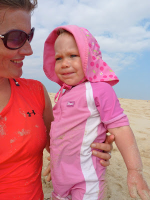 oops! A little too daring — a few waves knocked her down, but I was right there to scoop her back up. She was fine, just soaked. Time to put on a real swimsuit.