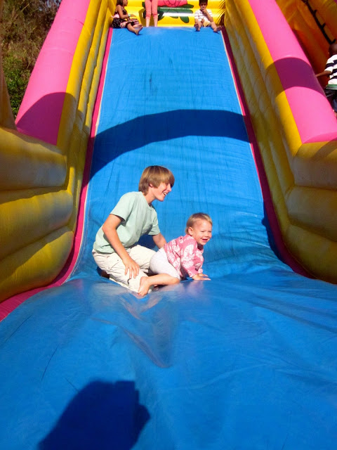 While I was inside eating lunch, Calvin was “babysitting” Camille and I turned around just in time to see him sliding her down the huge slide.