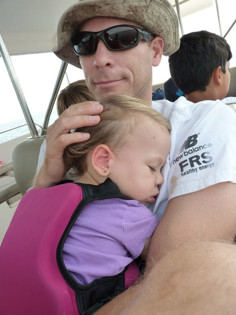 After we had our fill of dolphin watching the boat turned around and headed to a snorkeling spot — the wind in her face and the speed of the boat jostled her to sleep.