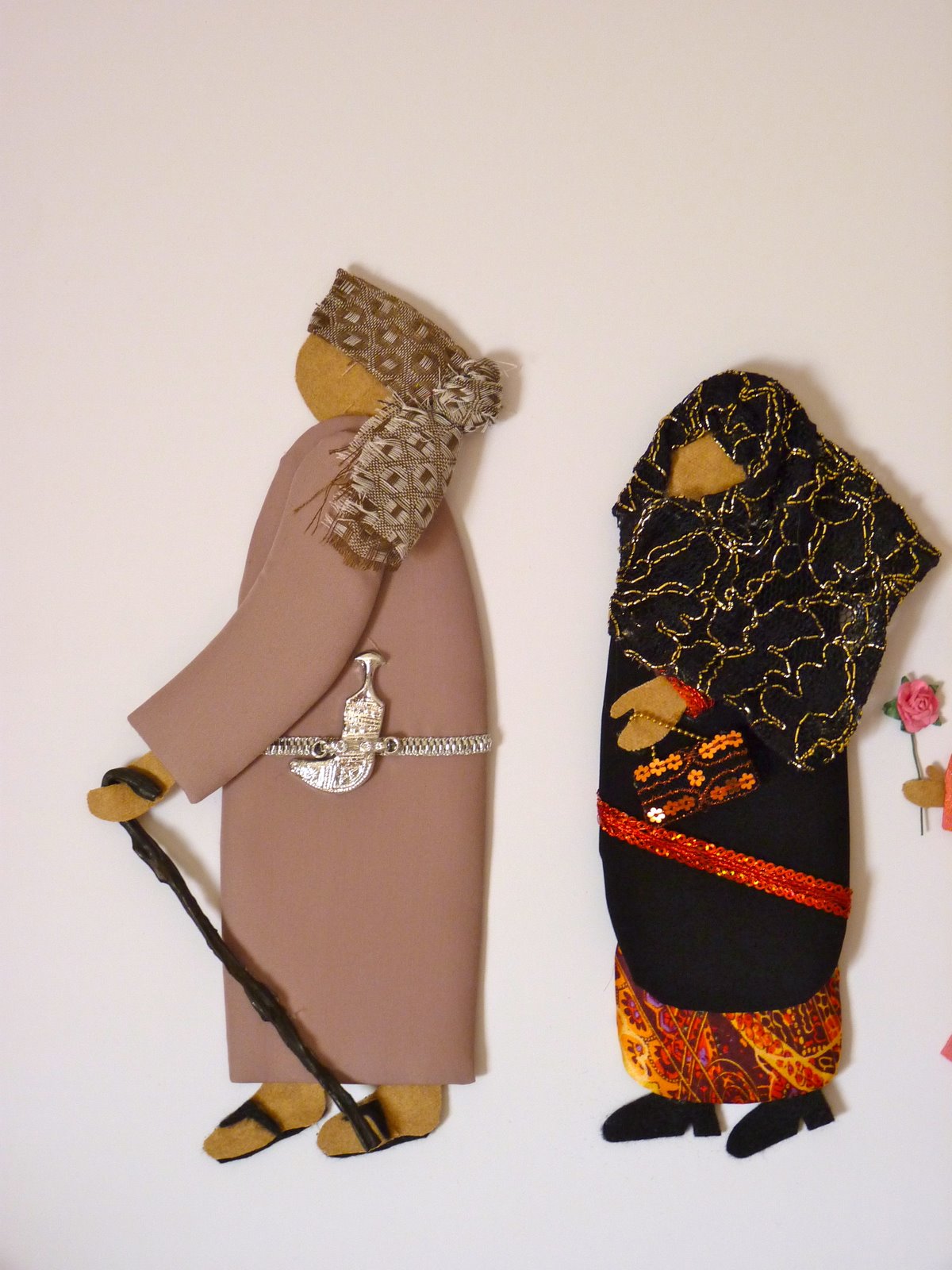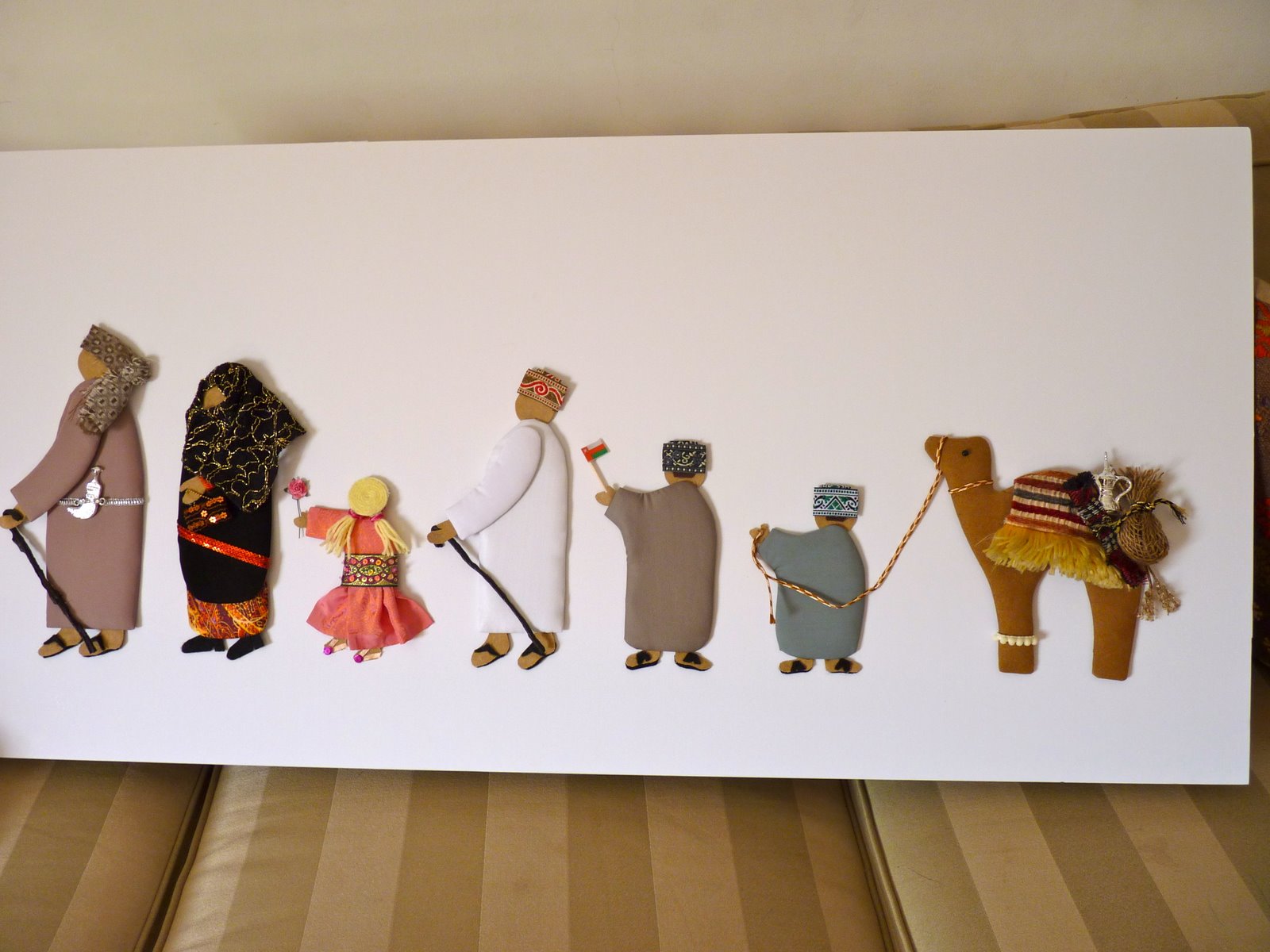 The bright spot in my week for the past month has been this class that I’ve been taking where they teach you to make Omani people. It’s 3 hours of fabric scraps, glue guns, ribbon, felt, yarn and beads — heaven on earth. You start with cereal box cardboard that has been glued to a thin layer of foam that has been cut out into standard forms of man, woman, girl, camel, etc. Or you can get adventurous and cut your own. You cover the pieces with fabric, decorate them, and then they are mounted on foam board to be framed.