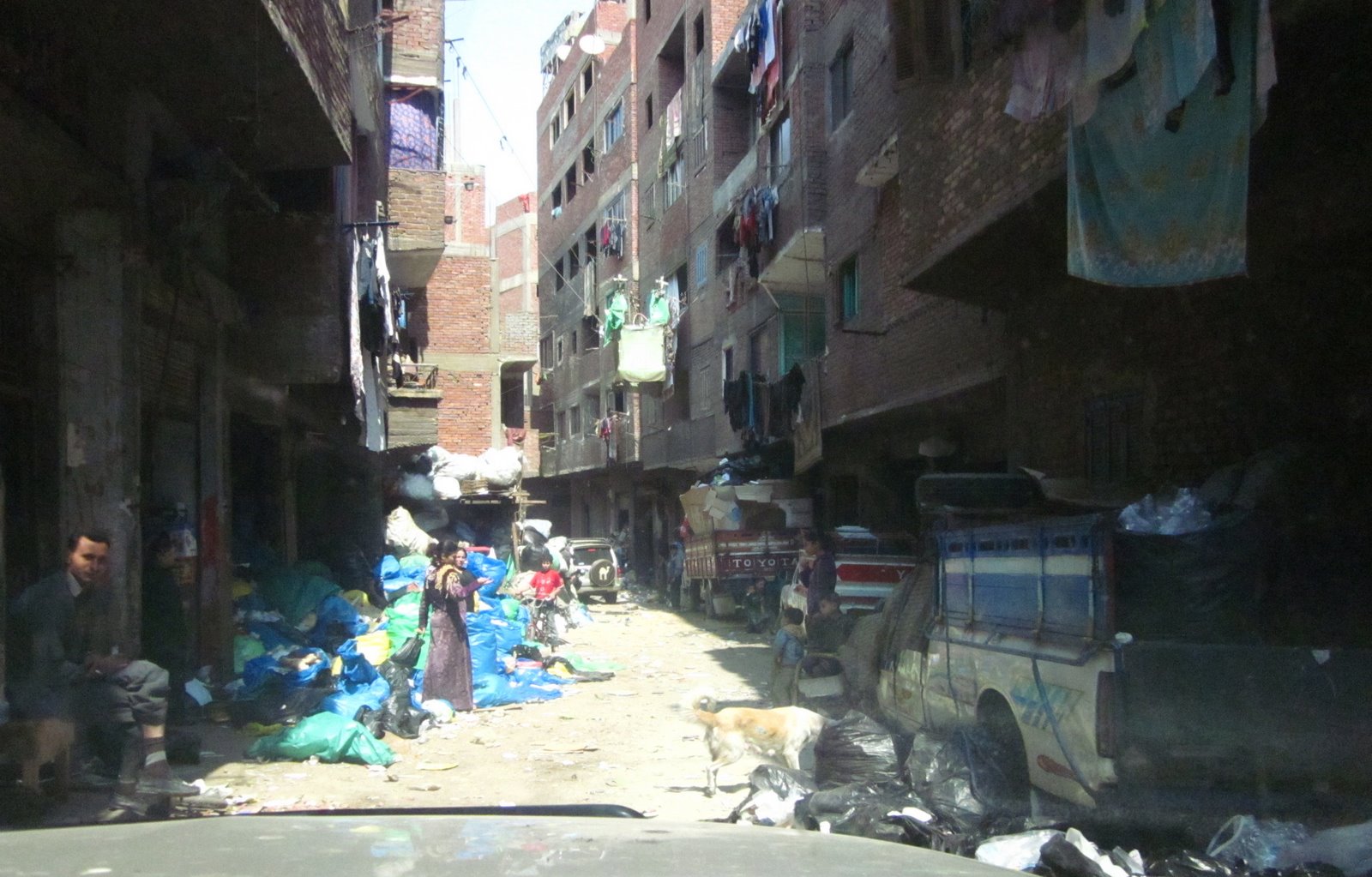 Inside every open doorway was more garbage, either sorted or waiting to be sorted. We could barely get down this street. I wanted to go to the store where they sell the handicrafts, but the local guy who was leading us in the front car didn’t know where it was. Next time.