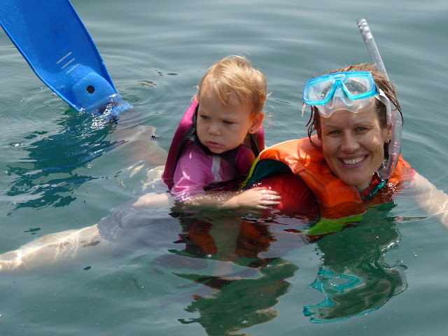 We went to a protected area (not that there are waves to contend with anyway, but we were surrounded by the mountains on all sides) and the boat captain dropped anchor above a coral reef. Josh was going to sit with the baby since she was still asleep, but as soon as the boat stopped moving, she woke up. Now what? Rock, paper, scissors for who gets to go in the water? Thankfully, I had a brilliant idea (if I do say so myself).