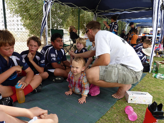 the boys had a rugby tournament. And I posted video from it, but not many photos. And then they had another tournament — which I didn’t take many pictures of, but it reminded me to go back and dig up the photos from the first tournament that I never got around to posting. So here they are. But first, girly from tournament II. Josh dressed her. I thought it was fantastic that he thought to put her tutu skirt on under her dress. I’ve always said he’s better at this fashion thing than I am.
