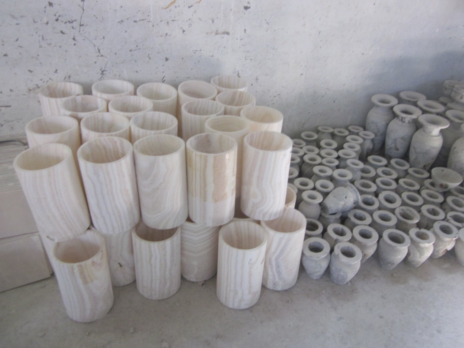 This piece is a partially completed vase mounted on one of their machines that grinds away the unwanted parts of the stone.