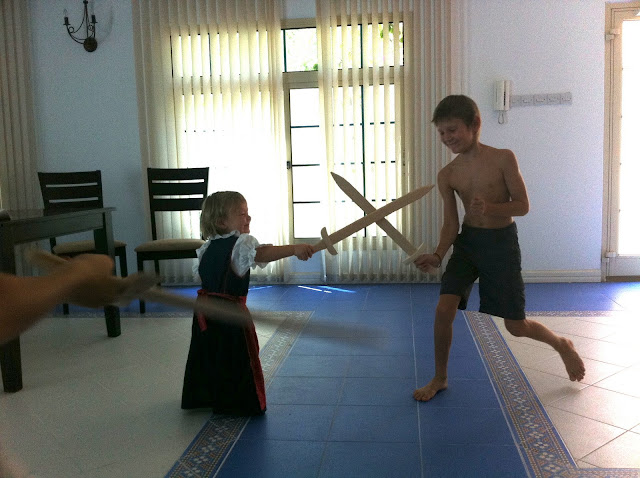 Like a good dad, Josh brought his daughter home something special. Unfortunately after she put her dress on, she went digging through his suitcase asking, “Daddy? Where my sword?” Oops. Thankfully she has kind older brothers who are happy to include her in their games of joust.