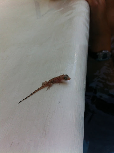 While Josh was gone, we had a visitor — this teeny tiny lizard that the boys found swimming in our pool. They scooped him out and let him dry off on the pool deck.