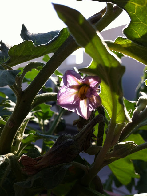 I have never grown eggplant before so I was excited to see the beginnings of this one — the flower fell off and left the tiny fruit behind. I didn’t even know what color eggplant this was when I picked up the seedling from the nursery. It looks like it’s becoming the pale purple and white variety.