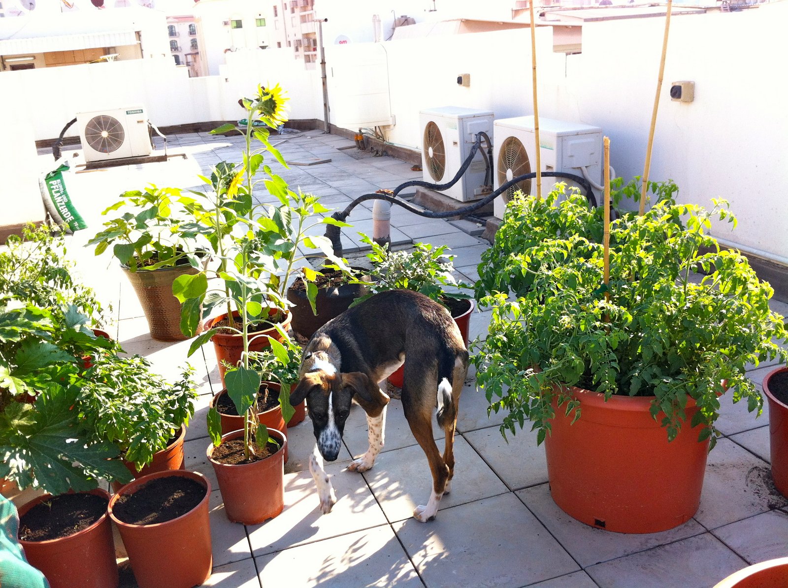 pepper in foreground, tomatoes in black pot on left and orange pot in center. Bushy things toward the back are squash. They are getting really big (the plants, no squash yet).