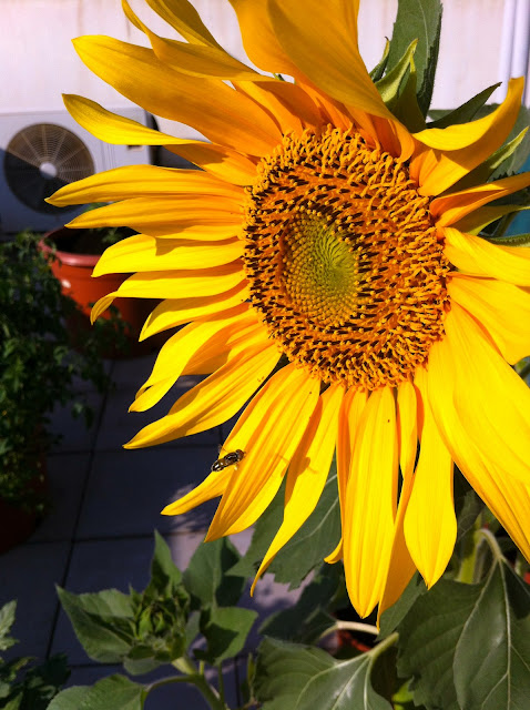 My sunflowers have flowered. I’ve seeded them in stages to attract bees and other pollinators. The newest seedlings are in the black pot on the left, the half grown ones are on the right and the ones that have flowered are in the back. If they were planted in the ground they’d be taller than I am, but being in pots stunts their growth a bit so the tallest ones comes up to my shoulder.