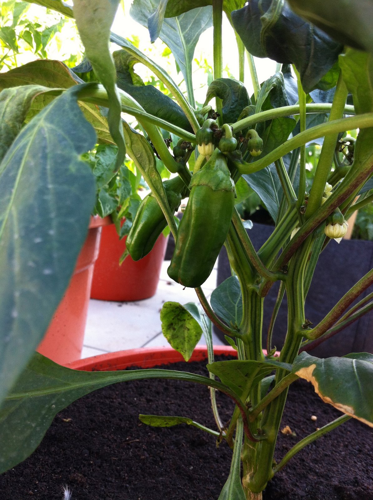 My peppers have peppers! I think these are bell peppers, not hot peppers, but I’ll know for sure as they take shape over the next few days/weeks.
