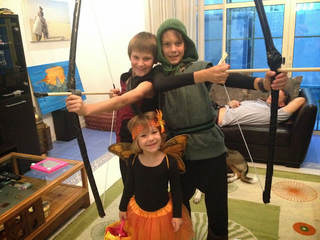 The boys entered the costume contest, but the real prize is the bow and arrow that they get to keep after the holiday is over.