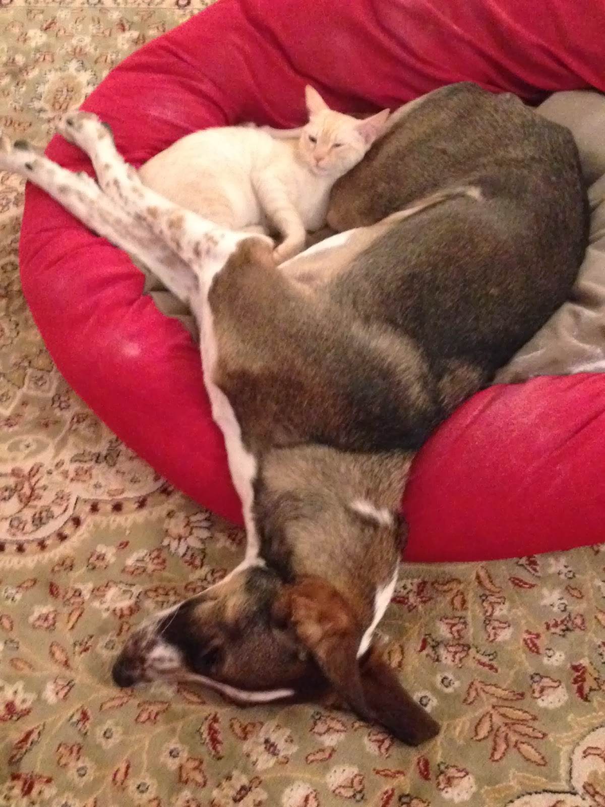 Tonight was extra special — I was trying to be less of a scrooge so I made spiced cranberry cider so they’d have something to drink while I read. Busy mouths are quiet mouths, right? I’m about 1/2 way through the first paragraph when the dog starts tearing from bedroom to bedroom, leaping on and off the beds, running in circles like he’s lost his mind. Back and forth, back and forth, the cat dashing from under one bed to the other, staying out of the way of the dog’s galloping legs. He sprints through the room, tail whipping back and forth and sprints back out. Like I can read over that racket. We hear a thumping noise and then the dog starts coughing — a honking, wheezing cough that is odd enough that I put down the book and go investigate. The pile of feathers in the middle of one of the beds is not what I wanted to see. The old down comforter finally gave up and the seams split in the middle of one of the dog’s skids. The dog, attempting to hork up the feathers, drank a bunch of water and promptly threw it up.