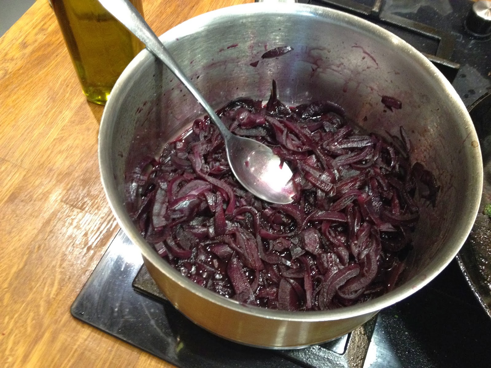 Caramelized onions in red wine vinegar and red wine. For some, this was their favorite dish of the night. It’s not much to look at, but the flavor is tart and sweet with strong acidity. The onions cook for about 40 minutes until they completely soften.