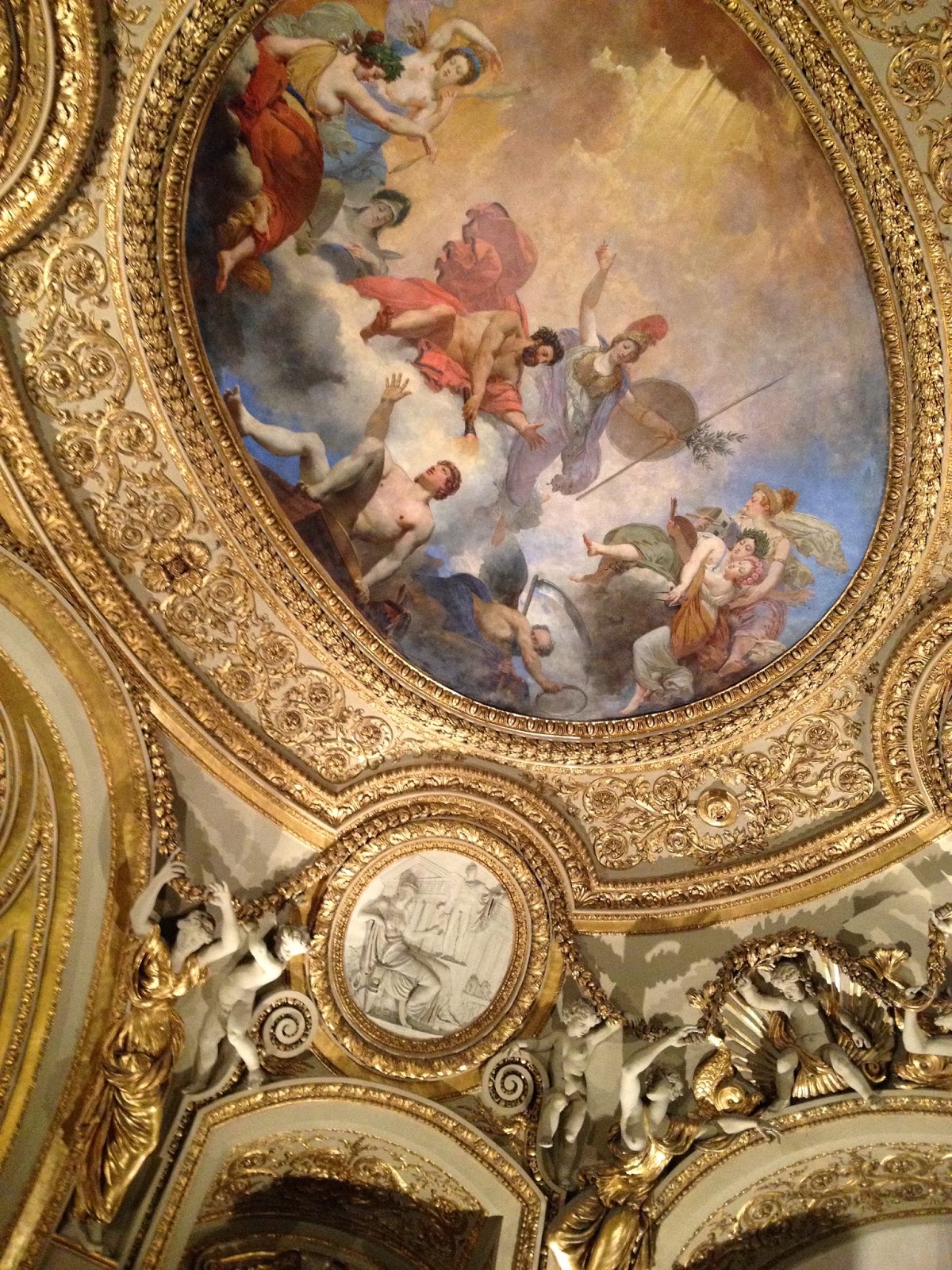 We only went to one floor of one wing, but that was enough for me at the end of a long day. Near the Mona Lisa were several of the ancient triptychs (the paintings on wood that were the early forms of Christian art) and tons of Renaissance Biblical art. Mary and baby Jesus, the disciples and Jesus, Jesus crucified . . .