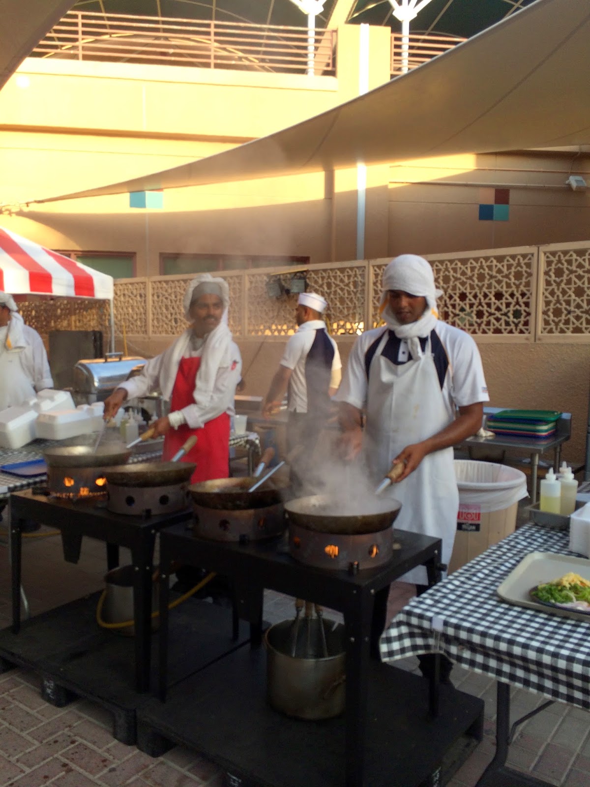 It’s incredibly hot for these guys working the skillets — it’s over 100 degrees, humid, and they are standing over a blazing fire. The guy with the wet towels draped over his head and around his neck was pretty smart.