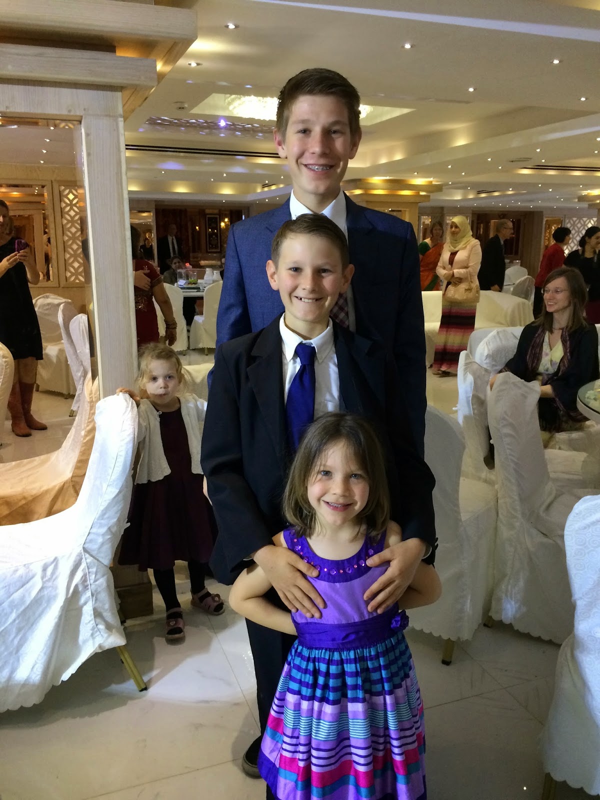 Ok, so maybe it sounds a little exotic. But in real life our life feels pretty ordinary. First of all, getting ready for our formal event included all the ordinary frustrations — like not being able to find shoes or socks. Caleb ended up wearing orange athletic socks with his black hand me down suit and blue tie (Calvin’s castoff from Wendy’s wedding 4 years ago. That suit is still giving back). And of course he didn’t have dress shoes so he wore his least banged up running shoes. I didn’t want to wear heels so I was debating between flats and boots up until the last minute. At 5:40 Josh started yelling at us that we were going to be late. See, totally ordinary!