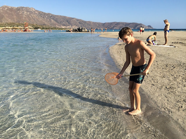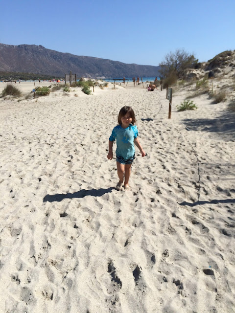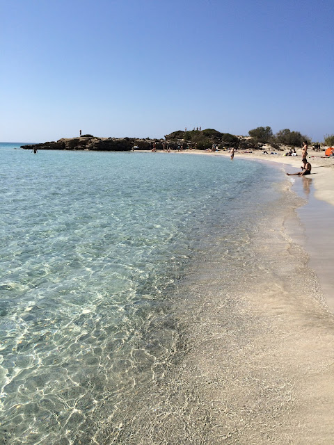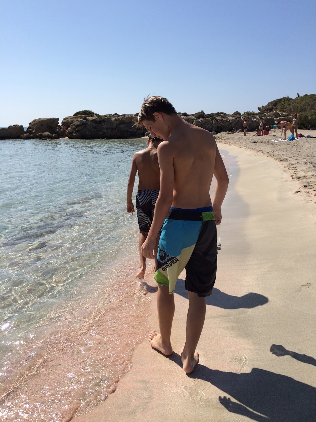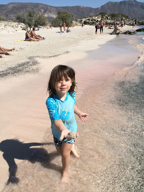 The legends of pink sand are true, but not in the way that Carmel is a white sand beach. Elafonisi beach was similar to our beach day further north on the same coast, the edges of the surf tinged pink with sand made of red coral. Beautiful and indeed pink, but the majority of the sand is beautiful plain golden/tan beach sand.