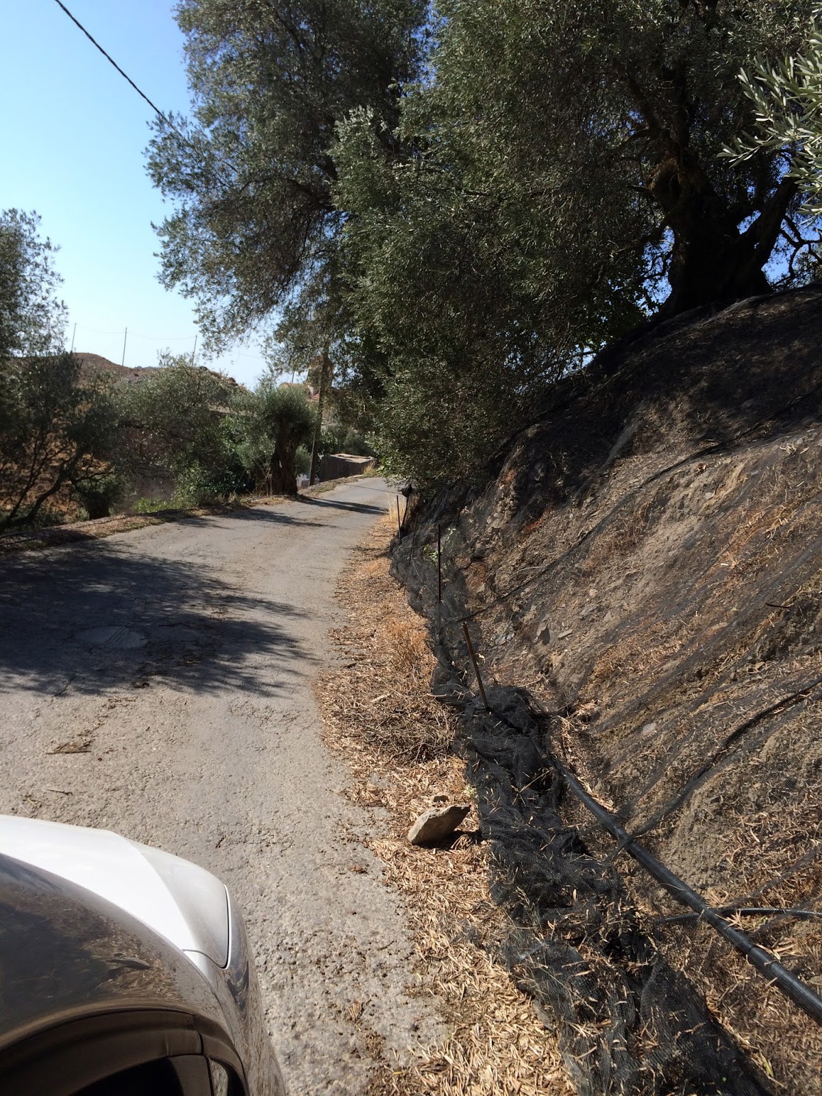 | The black netting is strung out under the olive trees to catch the fallen fruit |