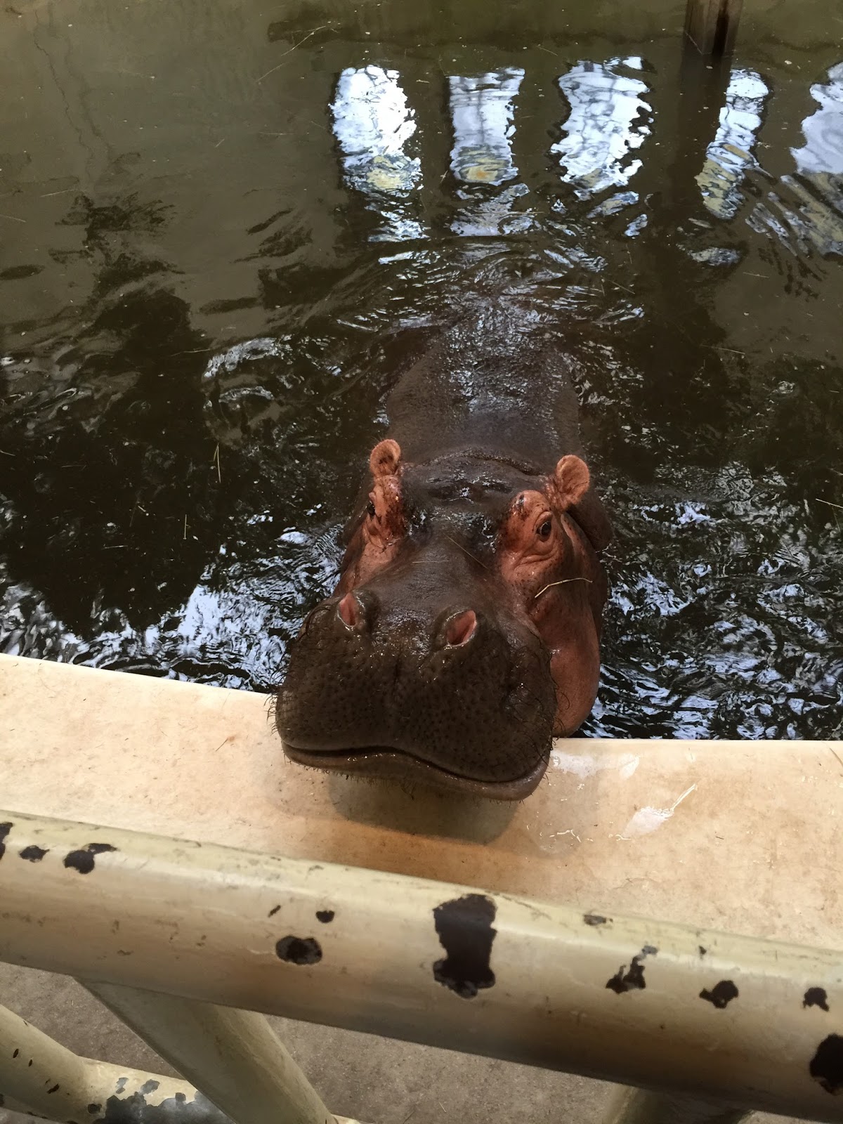 We walked into the beautiful, ornate, mosque-styled building and there were the hippos. Was it Hannah? One hippo was submerged, but the other heard us call her name and she swam right up to us and opened her mouth! Caleb yelled, “It is Hannah!”