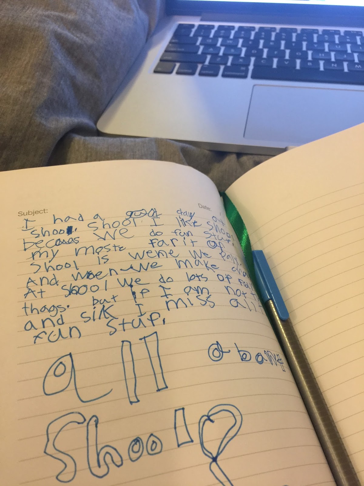 Writing in her journal (not for school, but for fun) all about how she loves school. She is her mama’s daughter.