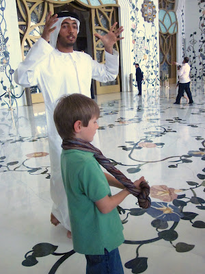 We learned all sorts of things about the design decisions for this mosque. All the surfaces in the mosque are beautifully decorated, except the walls that people face to pray. Those walls are either plain (in the women’s room — the women’s praying room, not the bathroom) or inscribed with the 99 names of God. That keeps people from wondering, “how many pieces of mother of pearl are in that enormous red flower?” when they’re supposed to be thinking reverent thoughts about God.