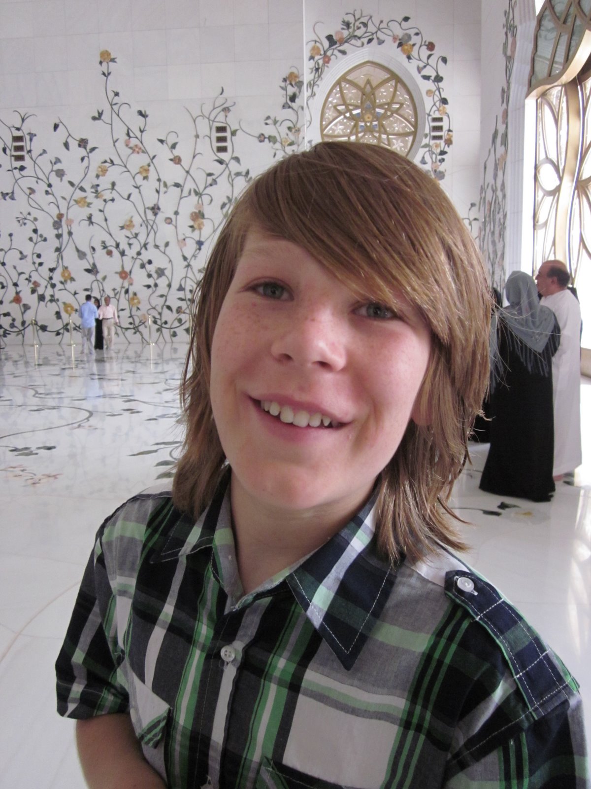 The “approved” photo. No touching, several inches of space between us, and hands behind our backs. All these interior pillars have mother of pearl inlay. It was amazing and I guess pretty impossible to do on a curved surface like a pillar. The carpet in here is the largest handwoven carpet in the world. Ali told us all the stats, but I’m going to have to refer to wikipedia to refresh my memory: It took 1200 people over 2 years to make it and it originally weighed 46 tons, but now weighs 35 tons. Ali made us guess where all the weight went and we guessed on people’s feet as they walked around on it, but it was more than that. Part of the weight loss was due to the cutouts for the pillars, but a bigger part was because the carpet was shaved three times. They shaved large straight swaths of the carpet, leaving small raised lines behind. The lines mark where people are to stand to pray, kind of like the lines in a parking lot. You can’t see them until you get up close. It’s a really ingenious way of organizing a large group of people into orderly lines.