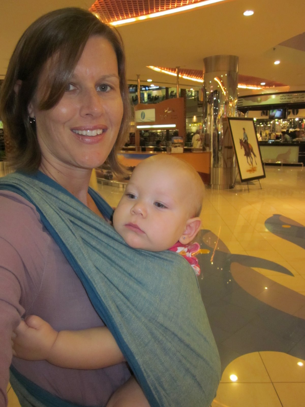 I love being able to wear her when we walk around. It’s easy on my back and I don’t have to maneuver a stroller in the crowds. No one wears their babies here. They all have strollers or carry them in their arms. Everyone looks at us when I’m wearing her, but she attracts attention whether I’m wearing her or not. I love walking behind Josh and people watching when he’s wearing her. Groups of women will nudge each other and point and smile. Especially when she’s hanging out on his back.