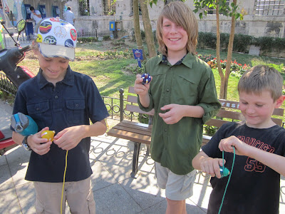 Caleb wanted one really badly, but he played it cool while Josh agreed on the appropriate number of Turkish Lira for three of them. They settled on 5TL, about $3. They paid for themselves many times over during the rest of our trip as the boys could pull them out of their pockets and entertain themselves if they got tired of sightseeing. How do they work? You’re supposed to wrap the string around the base of the top and then flick your wrist as you drop it — if you do it correctly the top will spin on the ground attached to the string — it looks like walking a dog on a leash. I never got the hang of it, but the boys were doing tricks and catching the spinning top in their hands, Globetrotter style, by the time we came back from Turkey.