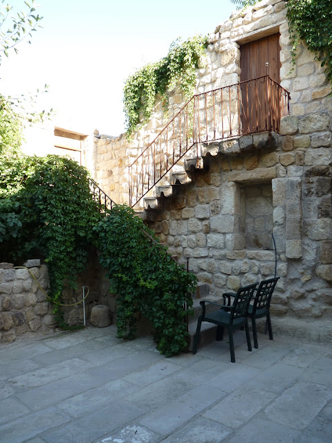 On the grounds are stone steps that go up and down and pathways that wind around to all the different rooms.